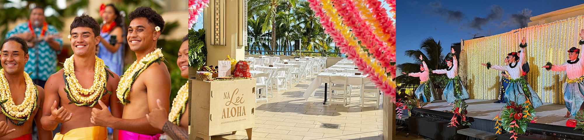 ナー レイ アロハ ディナー アンド ショーはワイキキの中心部にあるハイアット リージェンシー ワイキキ ビーチ リゾート & スパの星空の下の美しいテラスでフラショーを楽しめます。音楽とフラを織り交ぜてハワイのレイ作りの豊かな文化を表現。生のレイを沢山使ったフラショーで風が吹くたびに生花のいい香りが感じられます。プロデューサーは、フラダンサーとして著名なミス アロハ フラを受賞されたマヘアラニ・ミカさんが手がけ、本格的な演出と、最高のフラショーをお届けします。ディナーはホテルの「ザ・ビュッフェ・アット・ハイアット」のビュッフェ。ハワイ近海の新鮮な魚介類、生牡蠣、シュリンプカクテル、寿司からデザートまで、自慢の多彩なラインナップ。
