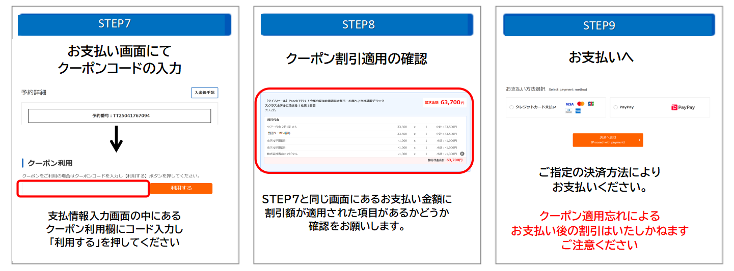 - 予約完了後の適用はできません。必ず予約中のクーポンコート登録欄へ入力をお願いします。