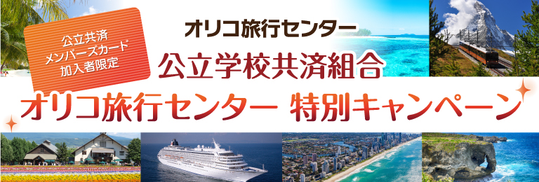 | 【注意事項】 ●本キャンペーンは、オリコ旅行センターでのご予約時のみ適用可能です。 ●オリコ旅行センターにてご予約時に、公立共済メンバーズカード会員様の旨をスタッフまでお申し出ください。 ●旅行代金のお支払いは、公立共済メンバーズカード(オリコカード)に限ります。 ●キャンペーン期間終了後の変更の場合、上記特典は適用対象外となります。 ●他のクーポン・キャンペーンとの併用はできません。 ●一部対象外商品がございますのでご利用時にスタッフにご確認ください。 ●特典の内容は、予告なく変更となる場合がございます。 |