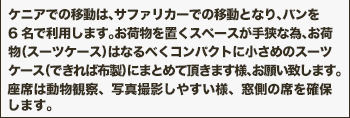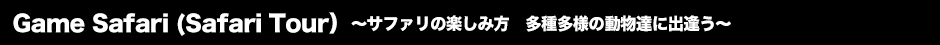 サファリカーで国立公園や動物保護区内などをゆっくりドライブしながら動物を発見し見物する事です。車でのサファリドライブのほか、湖でのボートサファリや徒歩でのウォーキングサファリなど様々なスタイルで楽しめます。動物たちがのびのびと生活をするありのままの姿を見る事ができます。動物を見る時間はその習性上、朝と夕暮れ時になります。動物を多く見れる時間を狙っていますが全ての動物を見れるとは限りません。サファリを熟知したガイドが同行いたしますので指示を守ってお楽しみください。
