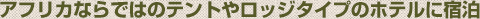 自然に囲まれたテント、または、ロッジに宿泊します。運が良ければ施設から野生動物を見られる事も。朝は鳥の声で目覚めるなど、より自然に溶け込む雰囲気をお楽しみください。