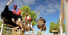 南アフリカではダチョウは一般的に食用として用いられています。また、80年代にはダチョウの羽を使ったファッションがブームとなったため、ダチョウの羽で巨万の富を得た人々もいました。そのため、オーツホーンの町にはフェザーパレス(羽毛御殿)があります。 ダチョウファームではダチョウのレースを見学したり、ダチョウの背中に乗ったり、卵の上に立つ体験が出来ます。