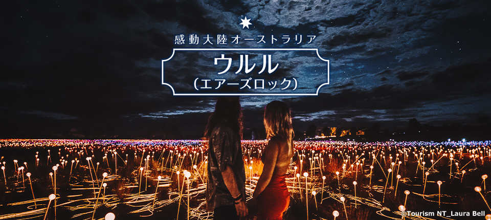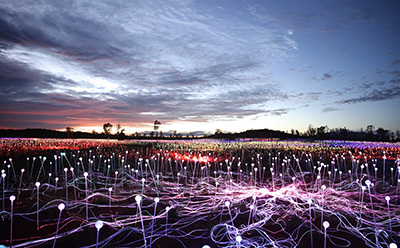 国際的に知られているイギリスの芸術家 ブルース ムンロによって生み出される光の芸術「フィールド・オブ・ライト」。彼のイルミネーションの中でも今までで一番大きな規模となり、世界遺産ウルル(エアーズロック)周辺の砂漠に約5万以上もの手作りの球状のガラスに光が灯されます。ウルル(エアーズロック)を背景に太陽光を利用した光の芸術をお楽しみください。