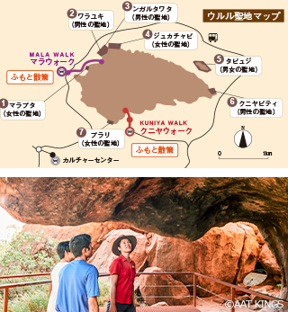 いまだ謎とされているミステリーポイント。周辺に砂漠地帯なのに1年中水が枯れない「ムティジュルの水場」や「ウルルの心臓」と呼ばれるハート形の窪みがある。また、先住民アボリジナルの壁画も見ることができる。