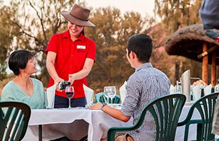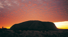 ウルルの日の入り会場で、スパークリングワインとおつまみをお召し上がりいただきながら、日の入りとともにしだいに真っ赤に染まってゆくウルルをご観賞ください。朝は、日の出とともにしだいにウルルがその姿を現わす荘厳な雰囲気をお楽しみください。