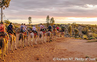 日の出時刻の1時間前に出発。暗闇から刻々と明るくなるにつれ、その色を変えてゆくウルルをラクダに乗って鑑賞します。砂漠のようなこの地にらくだはまさにピッタリ。ひと休みの際にはビリーティとビアーブレッドのサービスが付きます。