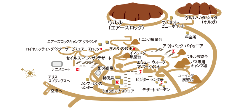 無料シャトルバスがリゾート内を10:30~24:00の時間帯に、毎日20分おきに運行しています。各ホテルからリゾートタウンススクエア、ウルルらくだ牧場、キャンプ場に発着します。