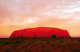 真っ赤な太陽に浮かぶシルエット。オーストラリアを代表する世界遺産として知られる「ウルル・カタ・ジュタ国立公園」です。かつてエアーズロックと呼ばれた「ウルル」は、高さ348メートル、周囲9.4キロの巨大な一枚岩です。早朝と夕刻、太陽の輝きを受けゆっくりと黄金に染め上げられていくウルルの様子は一生に一度は観たい地球の原風景。その威風堂々とたたずむその姿は、訪れる人々を圧倒する神々しさと美しさを秘めています。