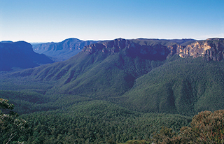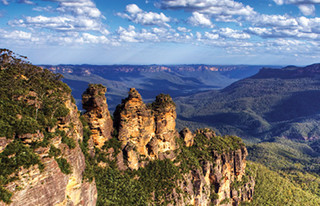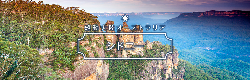 2000年に世界自然遺産に登録されたブルーマウンテンズ国立公園は、シドニー近郊の避暑地として地元のオーストラリア人にも人気です。観光の拠点となるカトゥーンバの街はシドニーの西方110km、車で約1時間半のところに位置しています。ユーカリの木々が放つ油分が日光に反射することによって山全体が青く霞んで見えることからブルーマウンテンズと呼ばれるようになり、青い樹海、延々と続く大峡谷の絶景は観光のハイライトです。