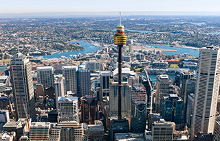 街のシンボル「シドニータワー」や高層ビルが建ち並ぶシドニーの中心。