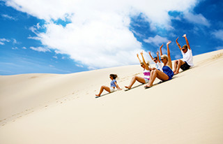 ネルソンベイから10分ほど、アナベイから南へ幅1km長さ32kmにも及ぶ広大な砂丘が広がります。見渡す限りの砂丘を4WD車で駆け抜けるツアーをはじめ、30mほどある砂丘の高いところから、板の上に乗って急こう配を滑り降りるサンド・ボーディングもスリル満点で人気のアクティビティです。