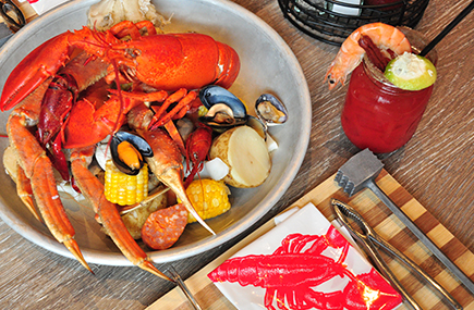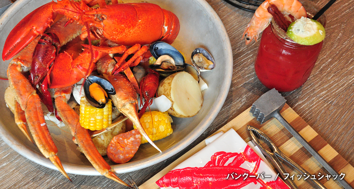 賑やかなグランビルストリートで地元民にも愛されるレストラン。一番人気のシーフードバケットは机の上いっぱいにロブスター、カニ、魚介類などが並び、木槌等で砕きながら豪快にいただきます。