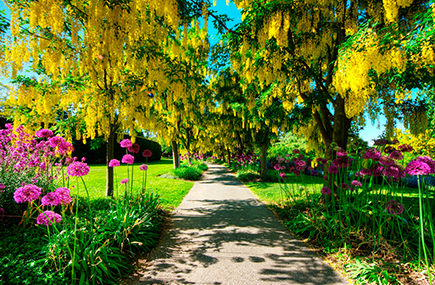 東京ドーム約17個分の広さを誇るバンデューセン植物園。園内にはテーマごとに植物が植えられ、季節ごとに様々な植物を観賞することができます。毎年5月になると、バンデューセン植物園の代名詞ともいえるキバナフジがシーズンを迎え、鮮やかな黄色いアーチが来園者を出迎えます。