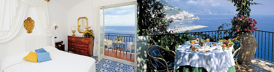 アマルフィ海岸の美観を見渡すクラシックホテル 貴族の館を改装した、断崖の上に建つ一度は泊まってみたいホテル。屋上にあるオープンテラスレストランからの景色はまさに絶景。ホテルのバーでは自家製リモンチェッロもお楽しみいただけます。