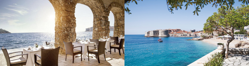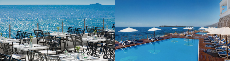 ドブロヴニク旧市街から5kmほどの半島に位置。館内に3つのレストランがあるのは同等クラスホテルの中でも最大級。プライベートビーチに続くプールやテラス席から眺める夕日は格別です。