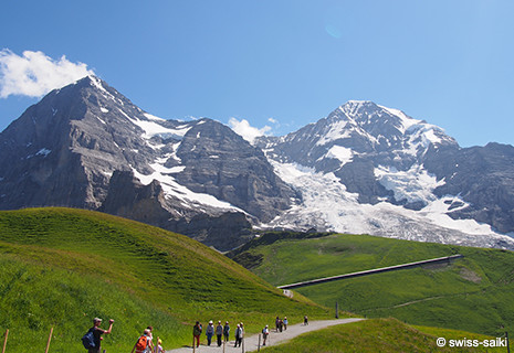 ユングフラウヨッホ駅までの鉄道の旅の後はアイガー、メンヒ、ユングフラウの景観を楽しみながらのハイキングがおすすめ。体力にあわせ、いくつかのハイキングコースが整備されているのもスイスならでは。日本語ガイドツアーもあります。