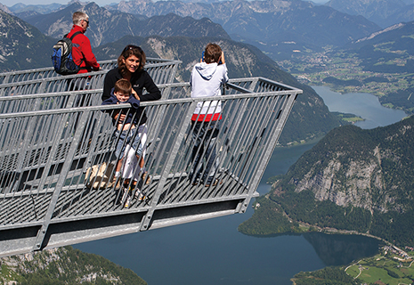 ハルシュタット湖畔の街、オーバートラウンからロープウェーでクリッペンシュタイン山の頂上(2,100m)に登り、進むと崖っぷちから空中に5本の指のように突き出した展望台があります。風景を絵画調に楽しめる金属の額縁が備わったもの、床がガラス張りになっているもの等それぞれ特徴があり、絶景とスリルを味わえます。