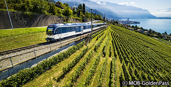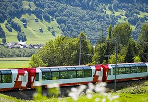 ツバイジンメン~レマン湖畔のモントルーを約2時間で結ぶ路線。天井までガラス張りのパノラマ車両でスイスらしい牧歌的な風景を楽しめます。