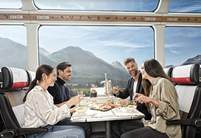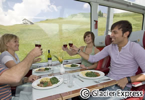 「氷河特急」では全車両が天井までガラス張りの新型パノラマ車両にて運行されています。