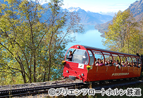 インターラーケンのブリエンツ湖からロートホルン山頂に向かう登山鉄道。傾いたSLがゆっくり客車を押し上げていくユニークなスタイルで人気。