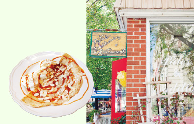 もっちりとしたクレープ生地の横に添えられた生クリームとバニラアイス。その上から自家製のキャラメルとチョコレートソースをたっぷりかけた、甘党には堪らない一皿。"ラ・ビズ・シュクレ(=お砂糖のキス)"とは納得のネーミングだ。フランス人オーナーによる店内のデコレーションも雰囲気たっぷり。
