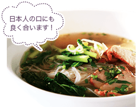 現地では朝食でもよく食べられる麺料理。牛肉や鶏肉、もやしなどの野菜が入ったさっぱりとした味がクセになるおいしさ!