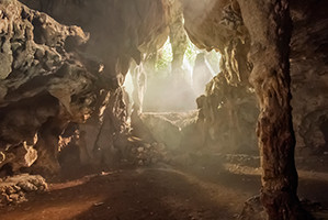 アンブロシオ洞窟1961年に発見された洞窟で、全長約200m。洞窟内には赤と黒の絵の具で描かれた線や渦巻きのような47個の岩絵が残されている。 |
