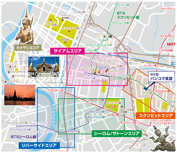 バンコク最大のショッピングゾーン。「サイアム・スクエア」や「パラゴン」などのデパート、こだわりのセレクトショップ、お洒落なカフェが並びます。誰もが1日中楽しめるエリアです。