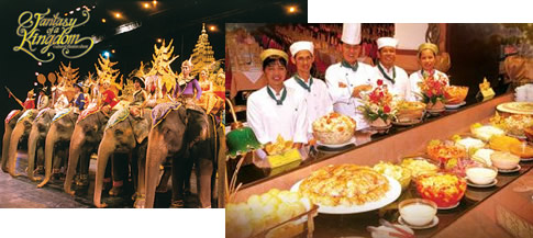 約140エーカーの土地に渡って造られた、夜のカルチャー&テーマパーク。4000人収容可能なゴールデンキナリーレストランにて、豪華ビュッフェディナーを。その後、象王の宮殿にて最先端のテクノロジーと特殊効果を駆使した、幻想的な豪華絢爛なショーをお楽しみください。出演者も約150人で、そのダンスは素晴らしく、象を約30頭使ったショーは迫力満点。
