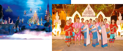 タイの歴史、各地方の文化を技巧を凝らした舞台美術で、分かりやすく演出するタイカルチャーショー。総勢100名以上の演出者が500着以上の豪華衣装で観客を魅了します。ショーの他に、施設内のタイ村では、タイのノスタルジックな雰囲気で、タイ各地の伝統的な生活風景や、手工芸品の実演作成を見学することができます。タイの豊かな文化をお楽しみ下さい。