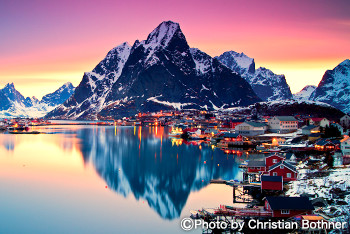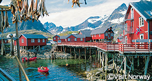 地元のノルウェーの人々も「ノルウェーで一番美しい」という海洋フィヨルドに囲まれたロフォーテン諸島。夏でも雪の残る険しい山々やかわいらしい漁村など古くからタラ漁の拠点として栄え、「絵葉書の中に入っていく」といわれるほど美しい景観です。