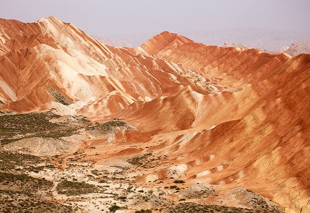 その名の通り、夕陽を受けて大地が徐々に紅く染まっていく様はまるで異空間にいるかのような美しさ。多彩な形にうねる地層が大地に見事な赤のグラデーションを生みだし、沈みゆく夕陽が大地に陰影を描きます。その光景は中国のグランドキャニオンとも称されます。
