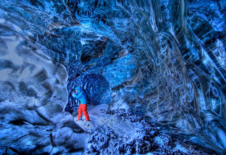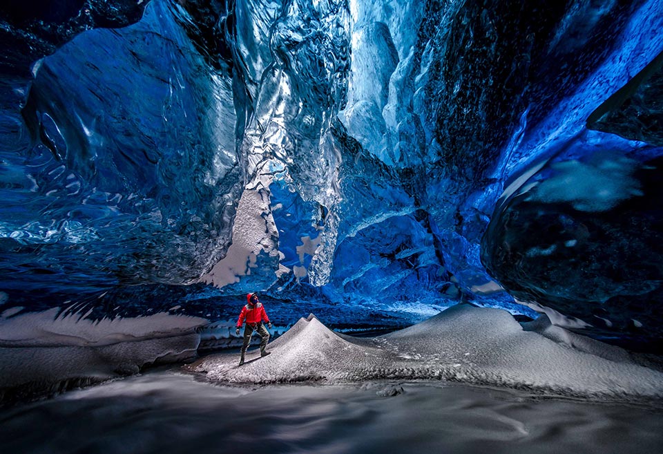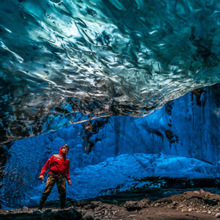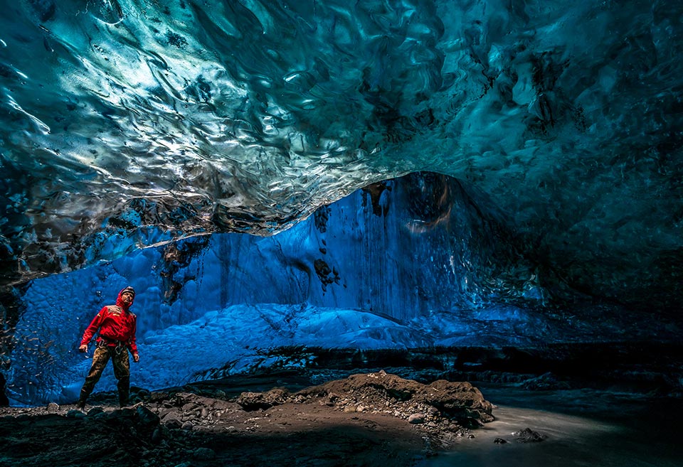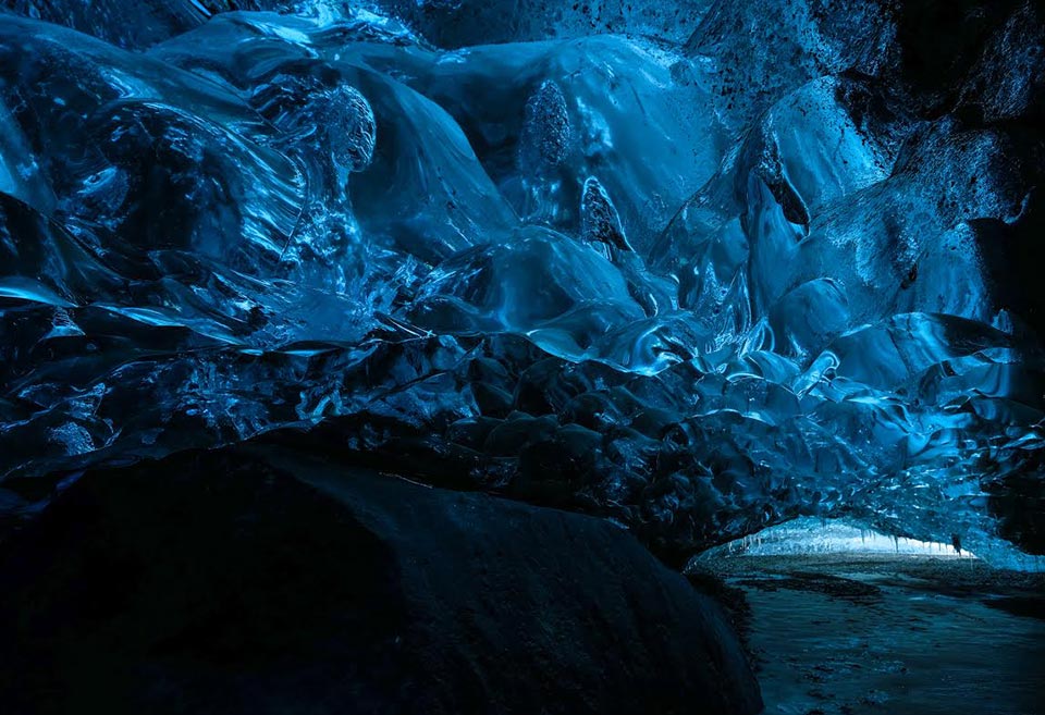 世界中から訪れる人々が目を見張るのは、氷河から放たれるまるでLEDのような青い輝き。氷河の洞窟内が青く輝く理由は、氷河が降り積もった雪によって押し固められて凍り、空気が押し出されて気泡を含まない純度の高い氷になるため。このような氷は太陽光のうち青色のみを透過するので、洞窟内からは氷が青く輝いているように見えるのです。