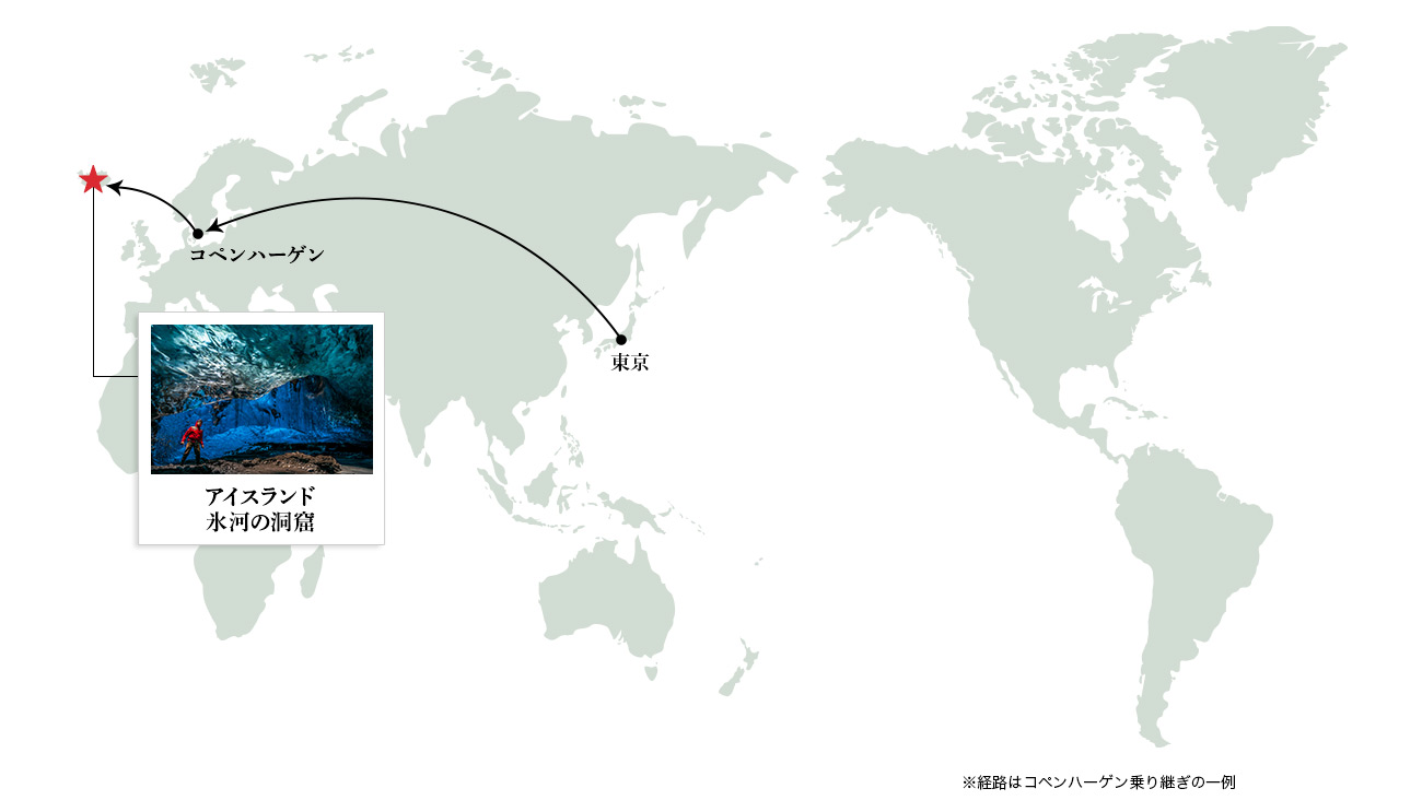 氷河の洞窟を目指すには、まずはアイスランドの玄関口レイキャヴィークへ。ヨーロッパ各地で乗り継ぎ、約18時間~かかります。日本からはスカンジナビア航空利用のコペンハーゲン乗継が便利です。