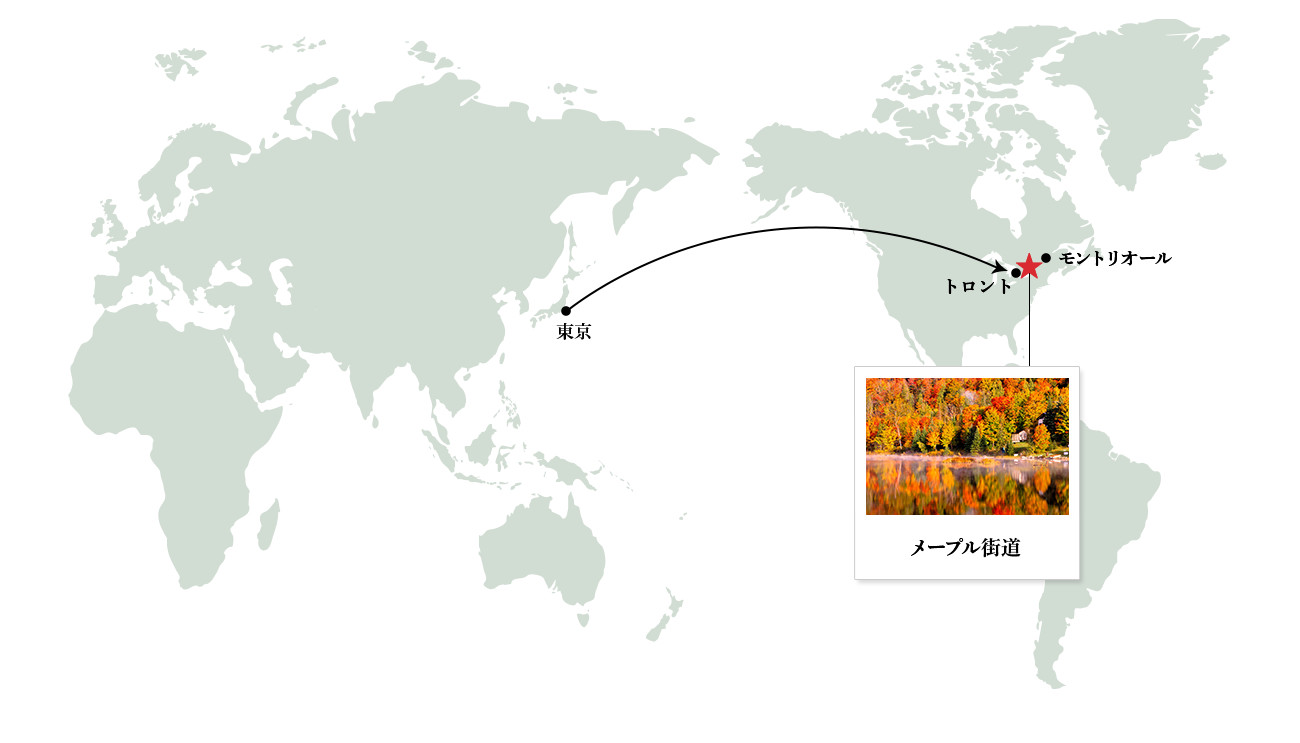 ・東京~モントリオールは、トロントもしくはバンクーバーの乗り継ぎ便で約15時間
