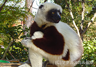 マダガスカル固有種のサル。手足が発達しており、枝から枝へ軽快に跳び移り、地上ではユニークな横跳びを見せます。神聖な生き物と崇められてきました。