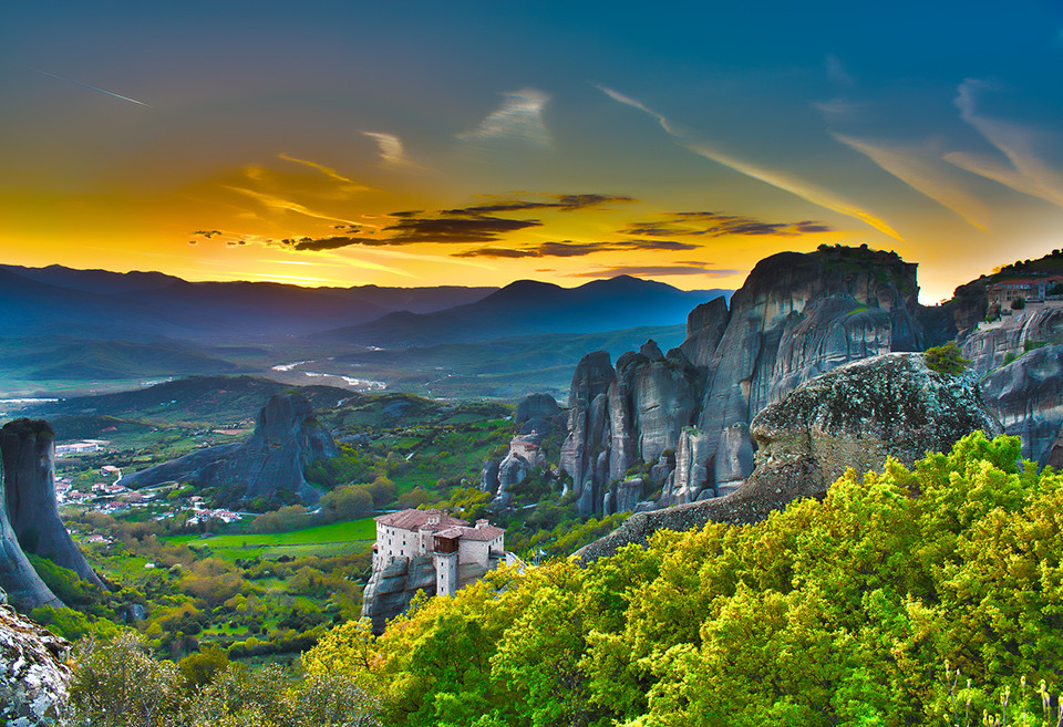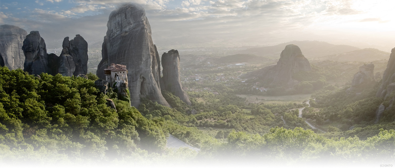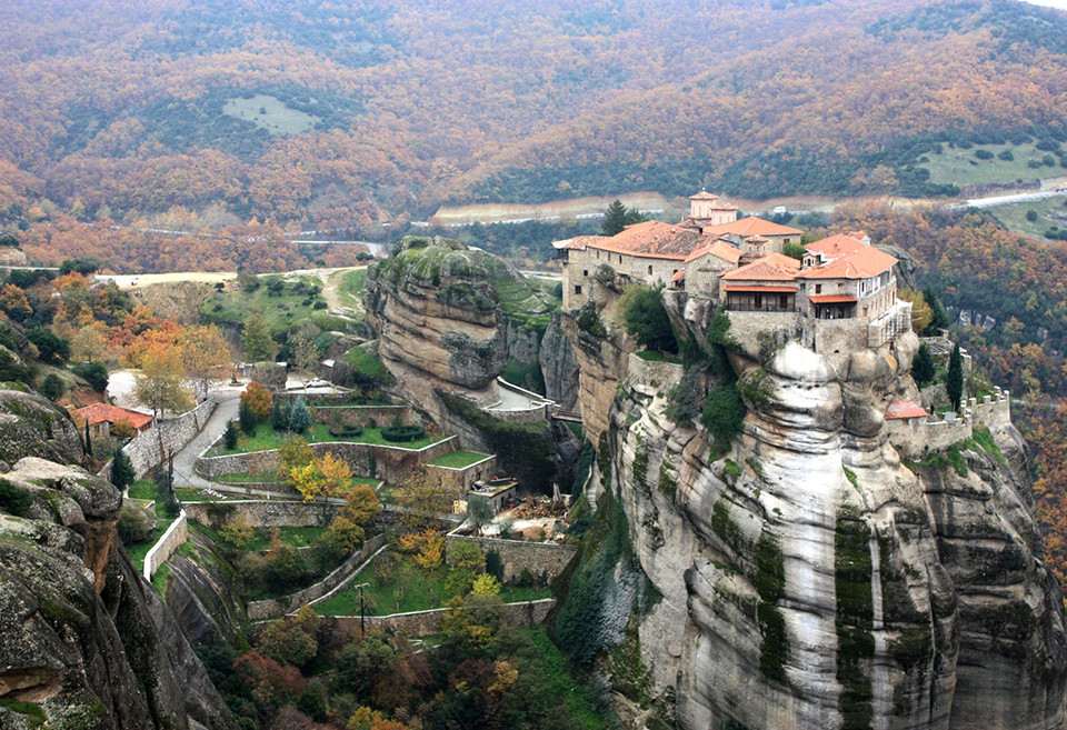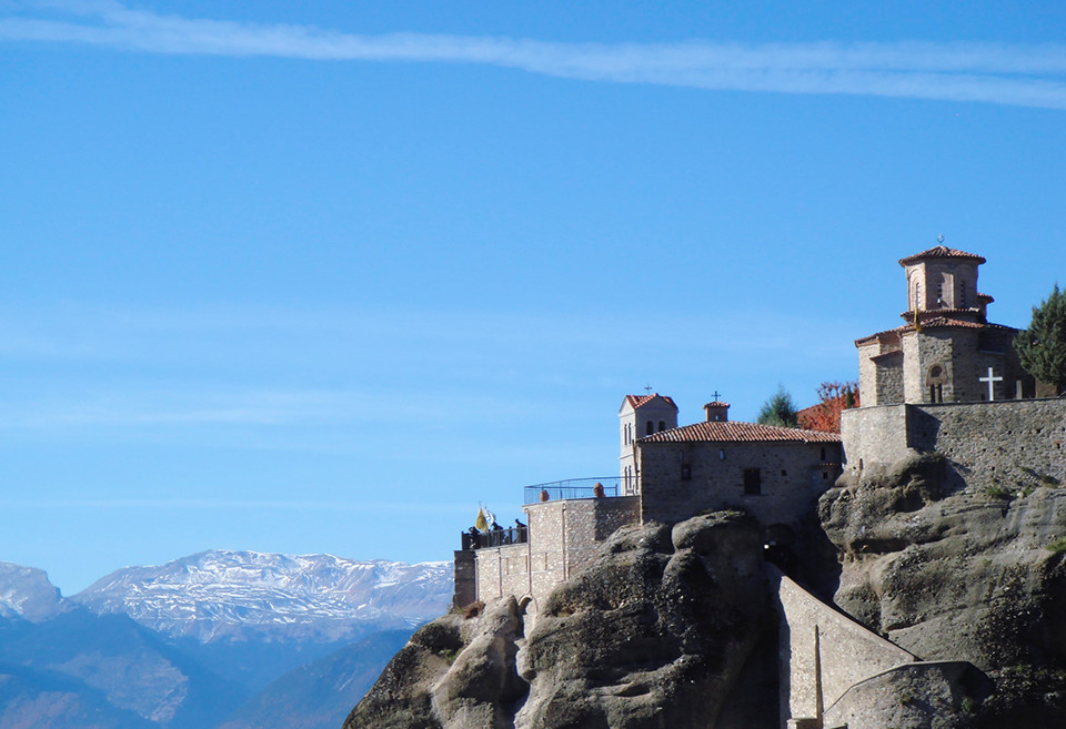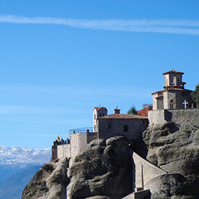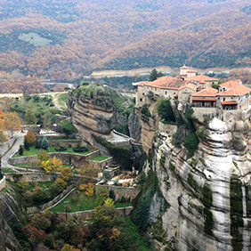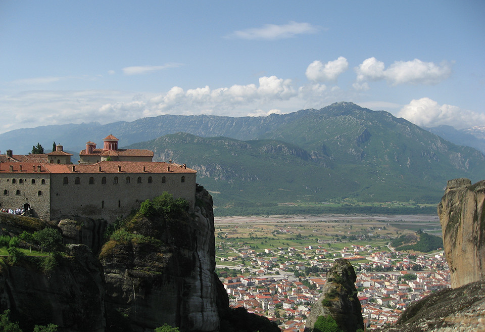 ギリシャのテッサリア地方ピンドス山脈の麓に、30m~400mの高さの岩の塔が60以上点在している「メテオラ」と呼ばれる地域があります。下界とは隔絶されたその岩の塔の頂上に、「メテオラ修道院」が建てられています。そそり立つ岩の塔に立つ修道院は、「メテオラ」(=現地の言葉で中空を表す)の名が示す通り、まるで空中に吊り下げられ、浮かんでいるかのように見えます。