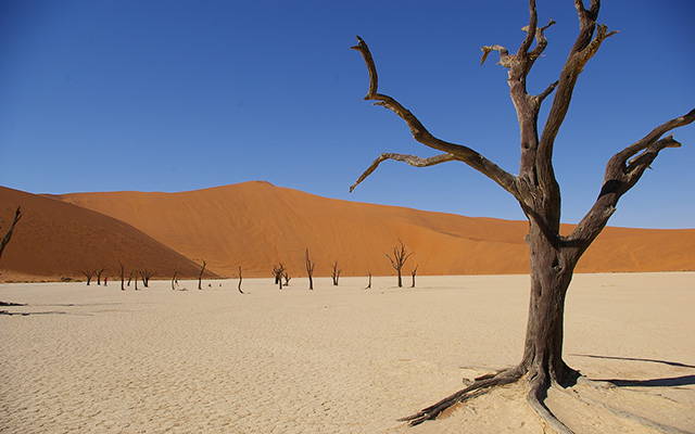 ナミブ砂漠で最も有名な絶景スポットは、砂漠の奥地ソススフレイ。そこはデッドフレイ(死の谷)と呼ばれる500年前までは湖だった場所。今はひび割れた干ばつ地帯が広がっています。