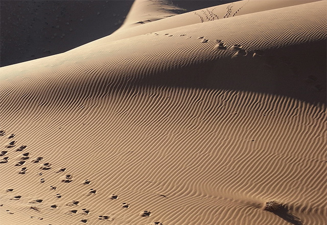 砂漠には約300mにもなる砂丘もあり、下から見ると圧巻の風景。このような砂丘がいくつも連なってこの一帯の荒野を形成していて、砂丘の頂上から見下ろす景色は、まるで異世界の砂の惑星のようです。