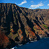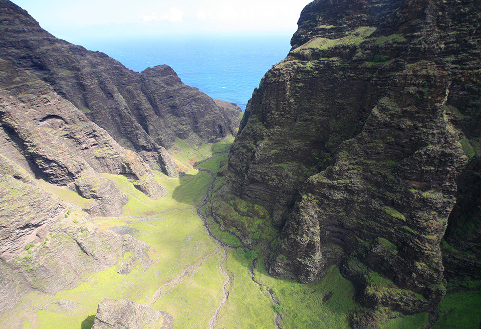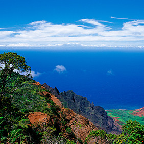 別名「ガーデン・アイランド」と呼ばれるカウアイ島には多くの川や滝が流れていて、その豊かな水に育まれた樹木が生い茂っています。切り立った断崖絶壁の岩肌も濃い緑で美しく飾られ、荒々しい崖の色、そして海の青のコントラスト。