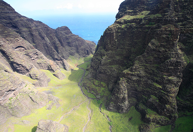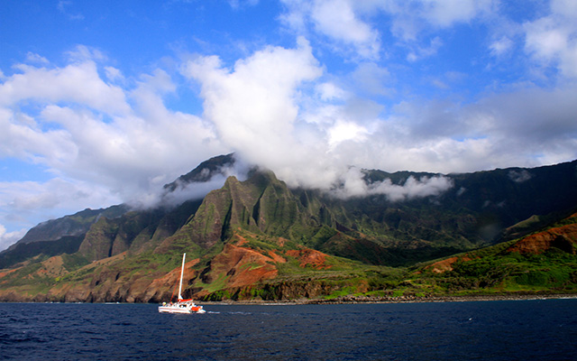 「ナ・パリ」というのはハワイ語で「絶壁」を意味し、時間の経過によって表情を変える切り立った岩肌は、不思議な威厳をたたえています。