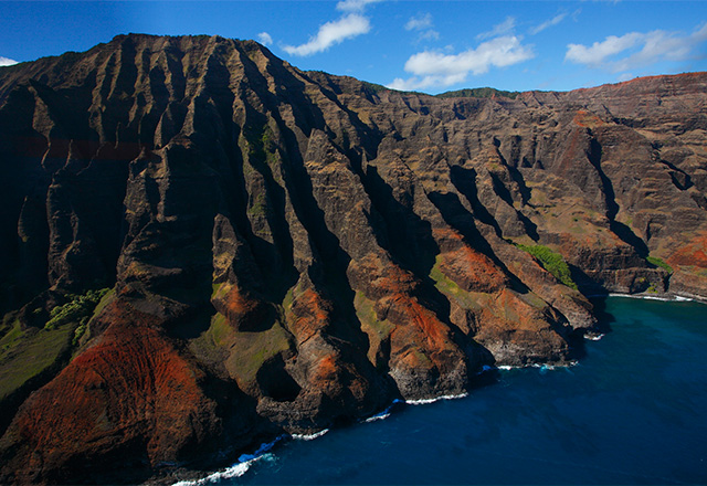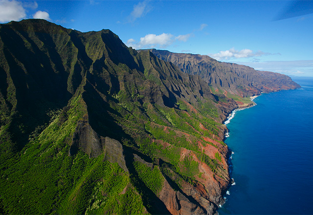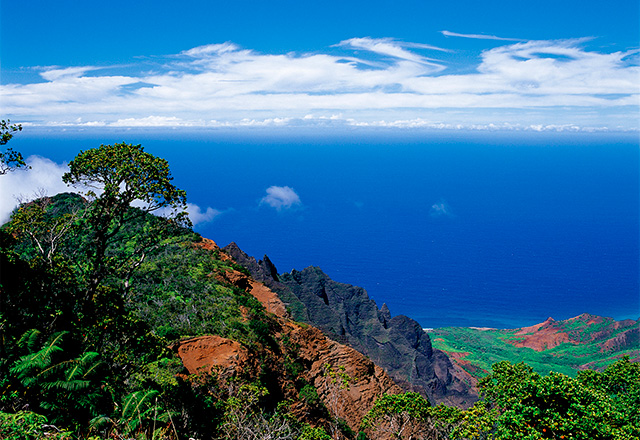 ハワイのカウアイ島は、今から約500万年前にハワイ諸島の中で最初に誕生したといわれています。島の誕生から長い時間の中で起こってきた隆起や風雨の浸食により作りだされたのが、全長25km・標高差約1000mもある断崖絶壁の海岸線「ナ・パリ・コースト」。