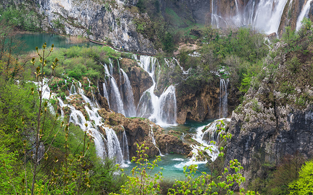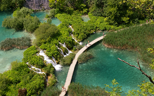 この湖群は、石灰華(石灰質堆積物)の働きで川に自然のダムが造られたことで生まれました。ミネラルや有機物の含有濃度、日光の角度などによってエメラルドグリーンやコバルトブルーに絶え間なく変化する水の色が森の緑と一体化し、そこに白い水煙を上げて流れ落ちる滝の姿。それが得も言われぬバランスとなって、まるで奇跡のような景観を生み出しています。