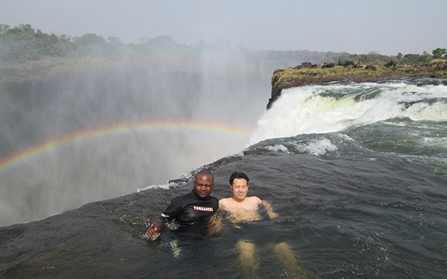 ザンビア側から滝を見に行くコースに、「デビルズプール」と呼ばれる場所があります。滝の端っこにできた天然のプールのような場所で、「デビルズ(悪魔の)」との名の通り、すぐ目の前は切り立った崖と滝!