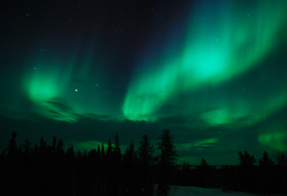 また、イエローナイフでは夏にオーロラ観賞を楽しめる土地でもあります。オーロラの発生条件は「天気が良く、雲がないこと」「空が暗いこと」「太陽活動が活発であること」の三つ。実は寒さは関係ありません。
