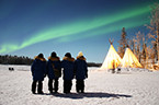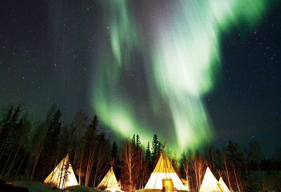 オーロラが出現する深夜までの間、カナダ先住民の住居「ティーピー」で温かく過ごして待つことができます。