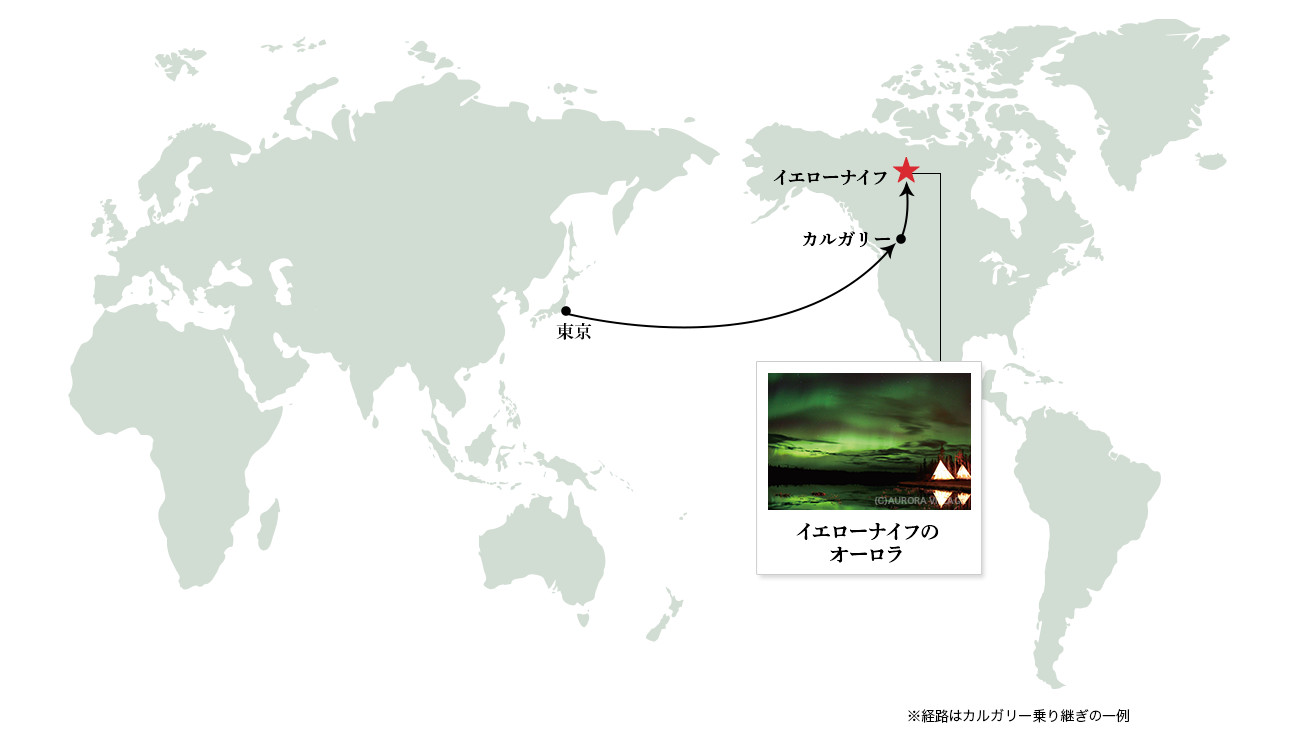 イエローナイフへは、一般的にカナダのカルガリーでの乗り継ぎ便を利用します。